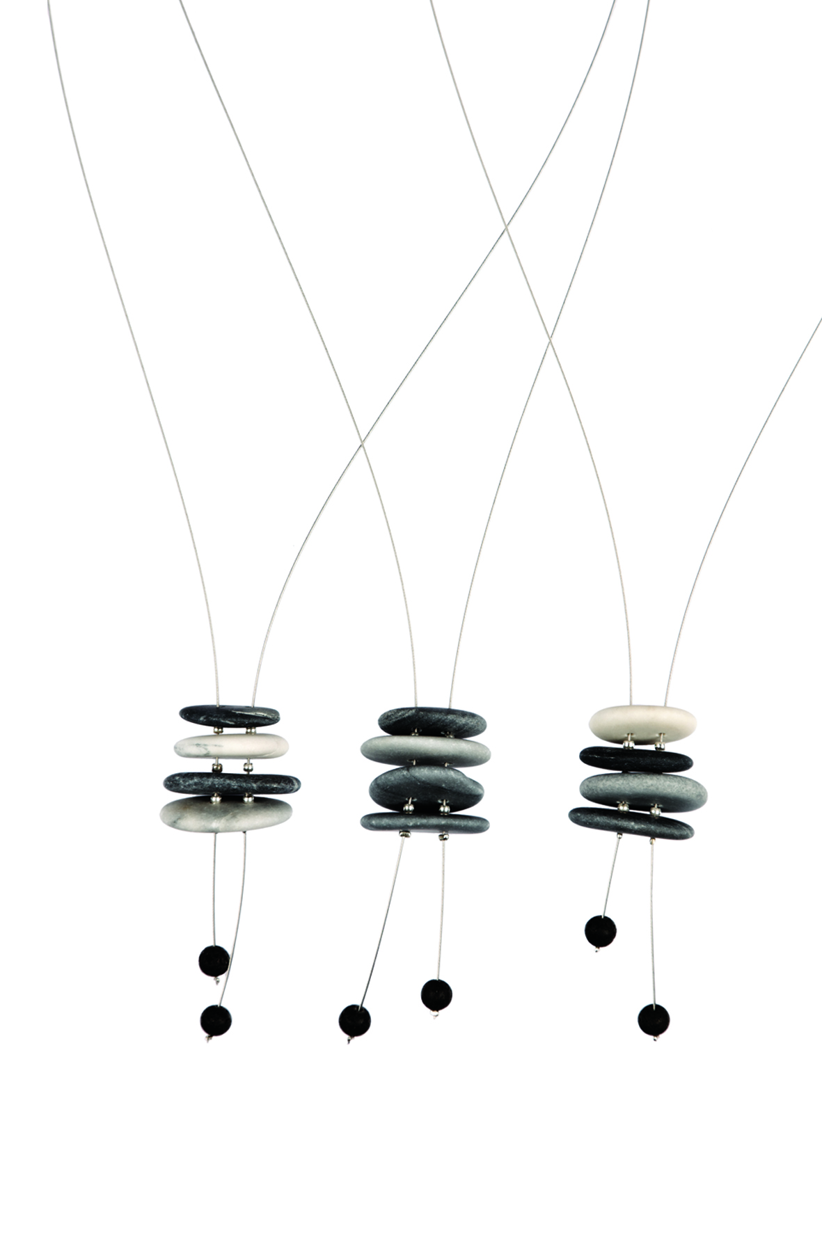 Diese leichte kann auch sehr gut über der Kleidung getragen werden. Die Lavakugeln an den Enden sind leicht versetzt und harmonieren mit den vier abgestuft großen Kieseln. Diese werden von kleinen Silberkugeln auf Abstand gehalten.